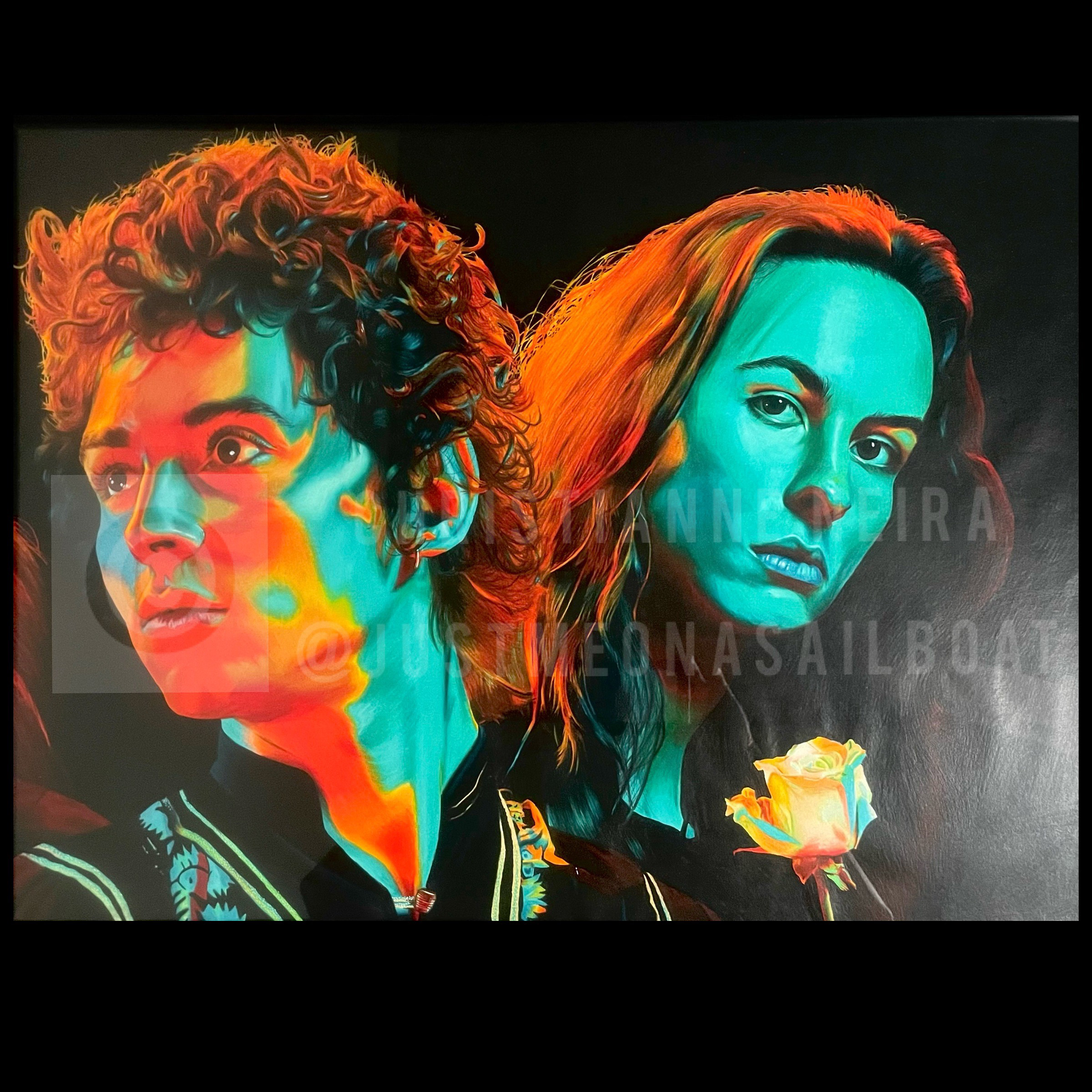 A 2-piece colorful portrait of the band Greta Van Fleet, made up of Danny Wagner and Josh, Sam and Jake Kiszaka. These are two, individual pieces of art being sold together as one. Each piece is 18″x24″, and come framed. This is a one of a kind, original piece of artwork and will not include the watermark on the actual art.